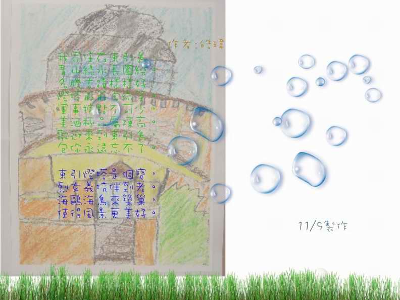 The Taiwan Schools Cyberfair is an interesting contest to me. During the production, we discussed the ways to promote the tourism industry here and tried to make Dongyin well known in the world. At the beginning, I thought the Cyberfair was a boring contest. While, I started to feel excited whenever I thought that I could compete with others with a computer. During the activity, we visited and talked with every family here, the Information Control Squadron, Amphibious Reconnaissance Battalion, Matsu National Scenic Area Administration and Light House keepers. Every visit impressed me, and I could still remember those interviewing processes even now. I thought that the Cyberfair activity requires efforts of both adults and children to complete, but without pressure. We had only the happy memories and interesting experiences at that time. We hope the activity could be held again, so that our juniors schoolmat es could also have this marvelous experience just like us. ¡ã¡ã Haowei |